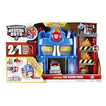 The Playskool Heroes Transformers Rescue Bots Electronic Fire Station Prime Playset isn't just a fire station it's a robot in disguise! Change your Fire Station Prime to the Optimus Prime robot figure when the adventure needs a robot hero to take charge! Press the button for lights and sounds, including 12 different phrases like "Let's roll out and save the day!" Let your CODY BURNS figure take the hero elevator to the top of the fire training tower and then slide down the fire pole. The "firing" water cannon is ready for any emergency, and the garage doors open! Stand your Heatwave the Fire Bot vehicle on its end to reveal the hidden robot on the underside of the vehicle! Whether it's an ordinary fire or a secret mission, your Heatwave the Fire-Bot vehicle and Cody Burns figure have the 2-in-1 station they need!